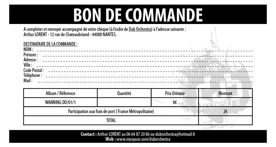 "DUB ORCHESTRA est formé en 2004 par cinq musiciens nantais. Issus pour certains du punk-rock et pour d’autres du reggae ou du dub, ils fusionnent les styles pour créer et revendiquer un dub instrumental qui sort des sentiers-battus et s'éloigne de l’origine du courant musical; le sound-system. Après un premier EP 4 titres et un premier album en 2008 intitulé « WARMING », voici maintenant 6 ans que DUB ORCHESTRA écume le grand-ouest et se forge une solide réputation, notamment par les tremplins remportés dont le dernier en date est celui des Jeunes Charrues 2009. Mais le quintet n’entend pas en rester là et enchaîne répétitions, résidences et studio, pour préparer la sortie nationale de son nouvel opus 12 titres « Sonic deviance » et la tournée qui suivra."